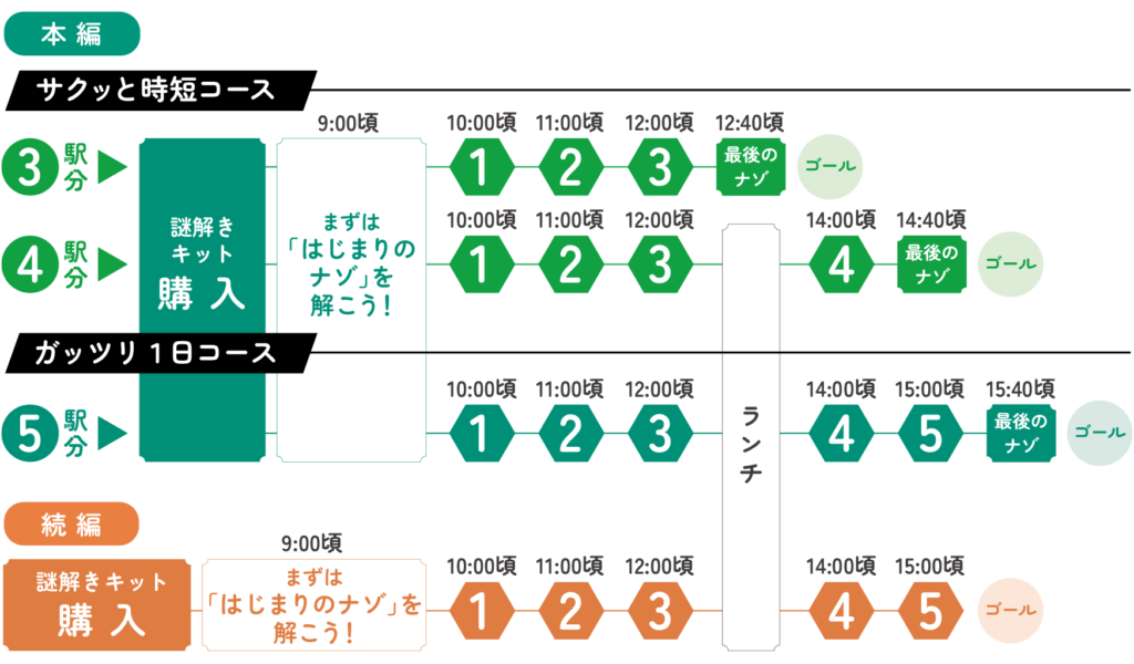 - 【スタンダード】4駅(約4時間〜): 謎解きと観光を両立したい人向け